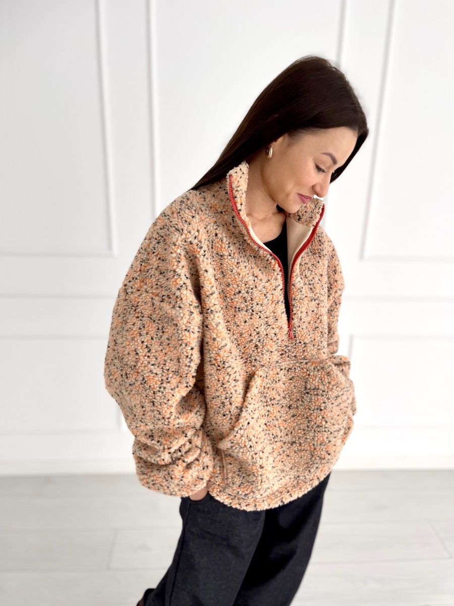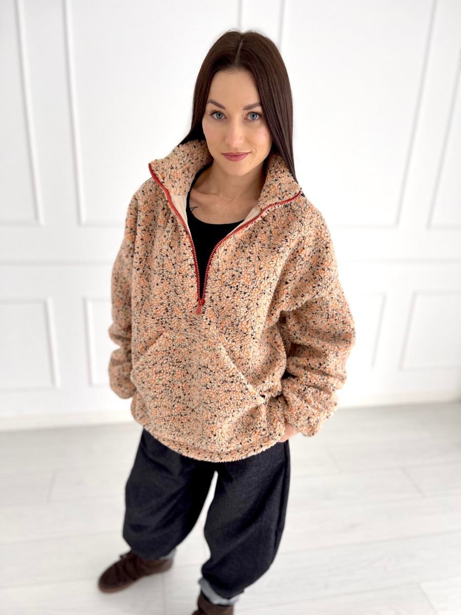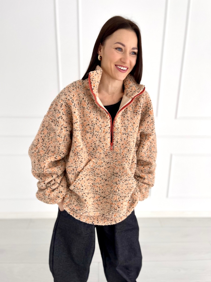 Niezwykle efektowna i ciepła oversizowa bluza z grubego futerka, która zachwyca wyjątkową miękkością i niepowtarzalnym stylem. Wykonana z mięsistego, przyjemnego w dotyku materiału, zapewnia komfort w chłodniejsze dni. Jej oryginalny melanżowy wzór w kolorowe kropeczki nadaje całości charakteru, czyniąc ją idealnym wyborem na sezon jesienno-zimowy.