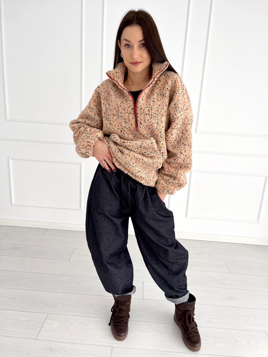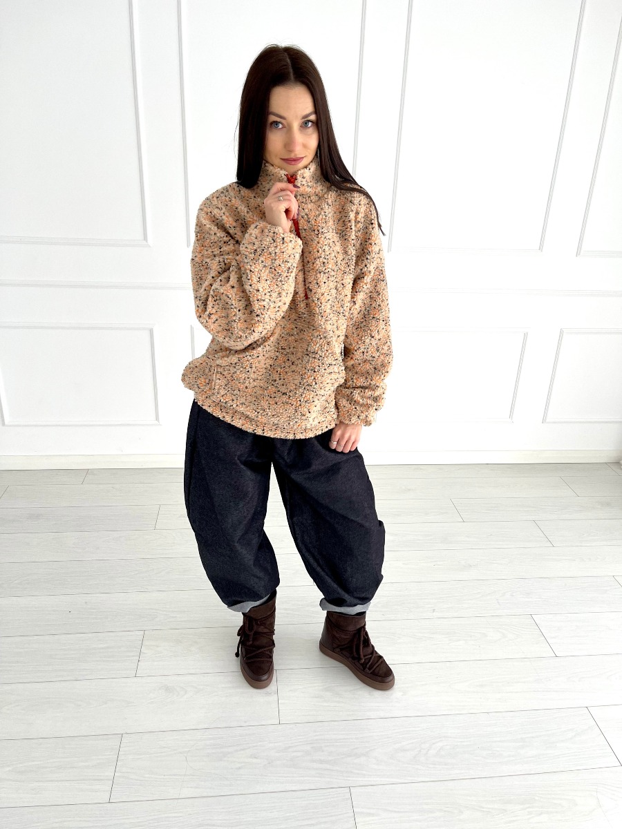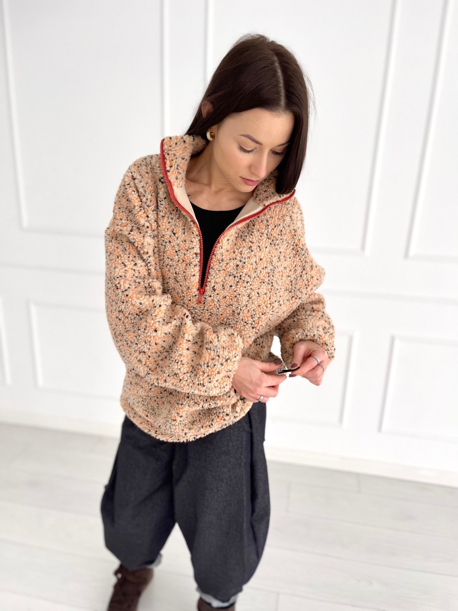 Niezwykle efektowna i ciepła oversizowa bluza z grubego futerka, która zachwyca wyjątkową miękkością i niepowtarzalnym stylem. Wykonana z mięsistego, przyjemnego w dotyku materiału, zapewnia komfort w chłodniejsze dni. Jej oryginalny melanżowy wzór w kolorowe kropeczki nadaje całości charakteru, czyniąc ją idealnym wyborem na sezon jesienno-zimowy.