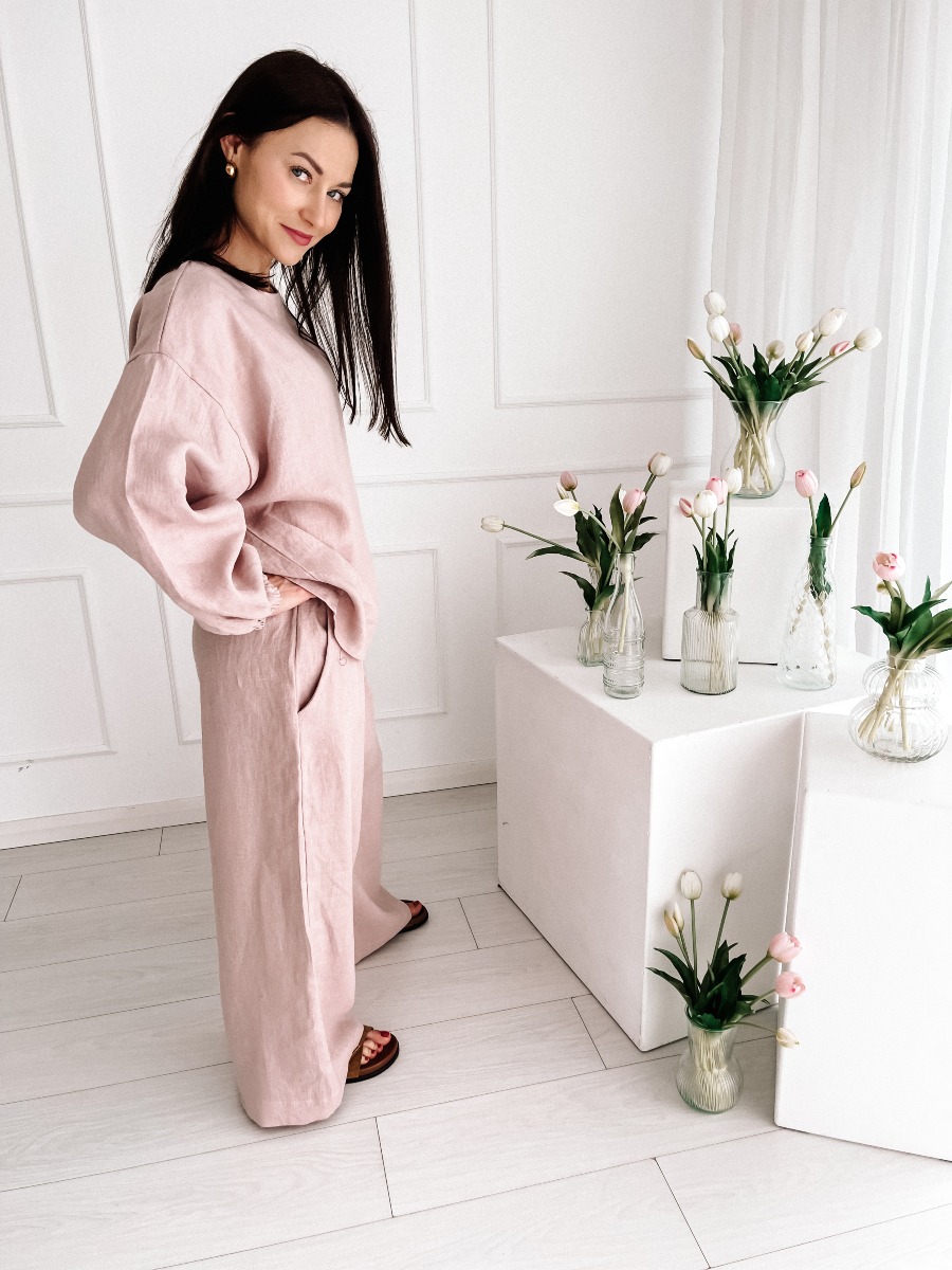 Delikatny jasnoróżowy pastelowy kolor rozświetla stylizację i doskonale komponuje się z bielą, beżem, denimem oraz naturalnymi odcieniami lnu.
