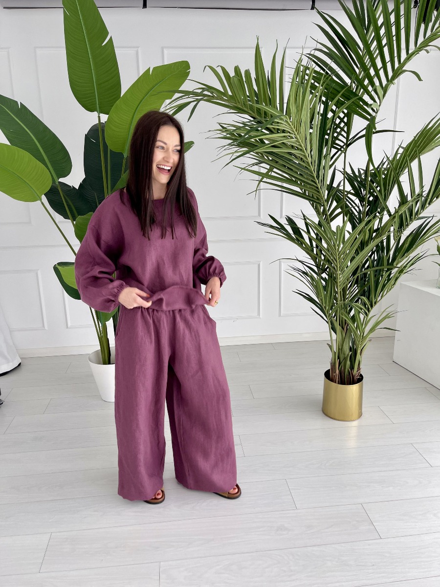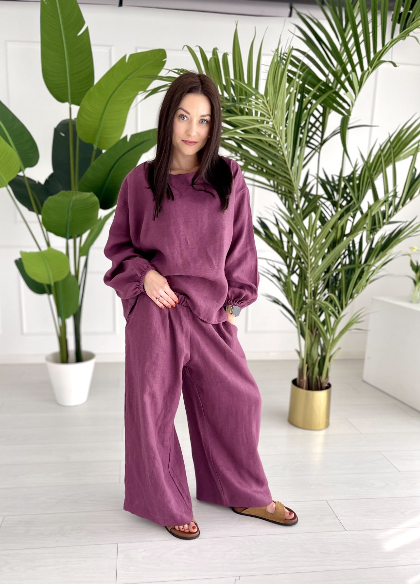 bluzka lniana oversize w kolorze purple fig – 100% len | Dekolt łódka, bufiaste rękawy