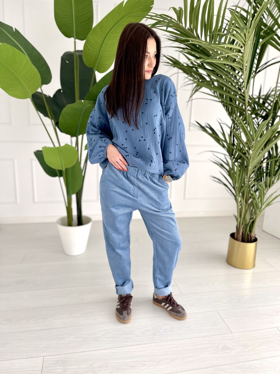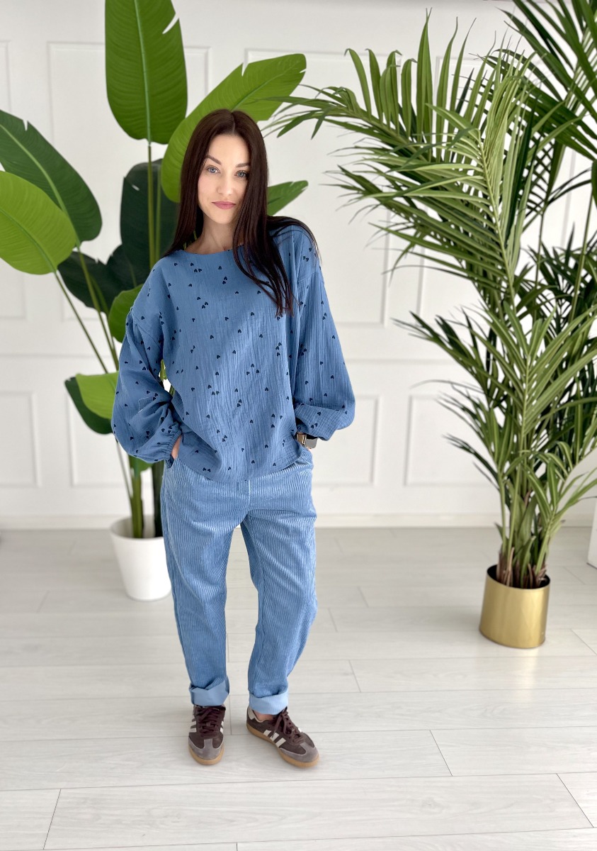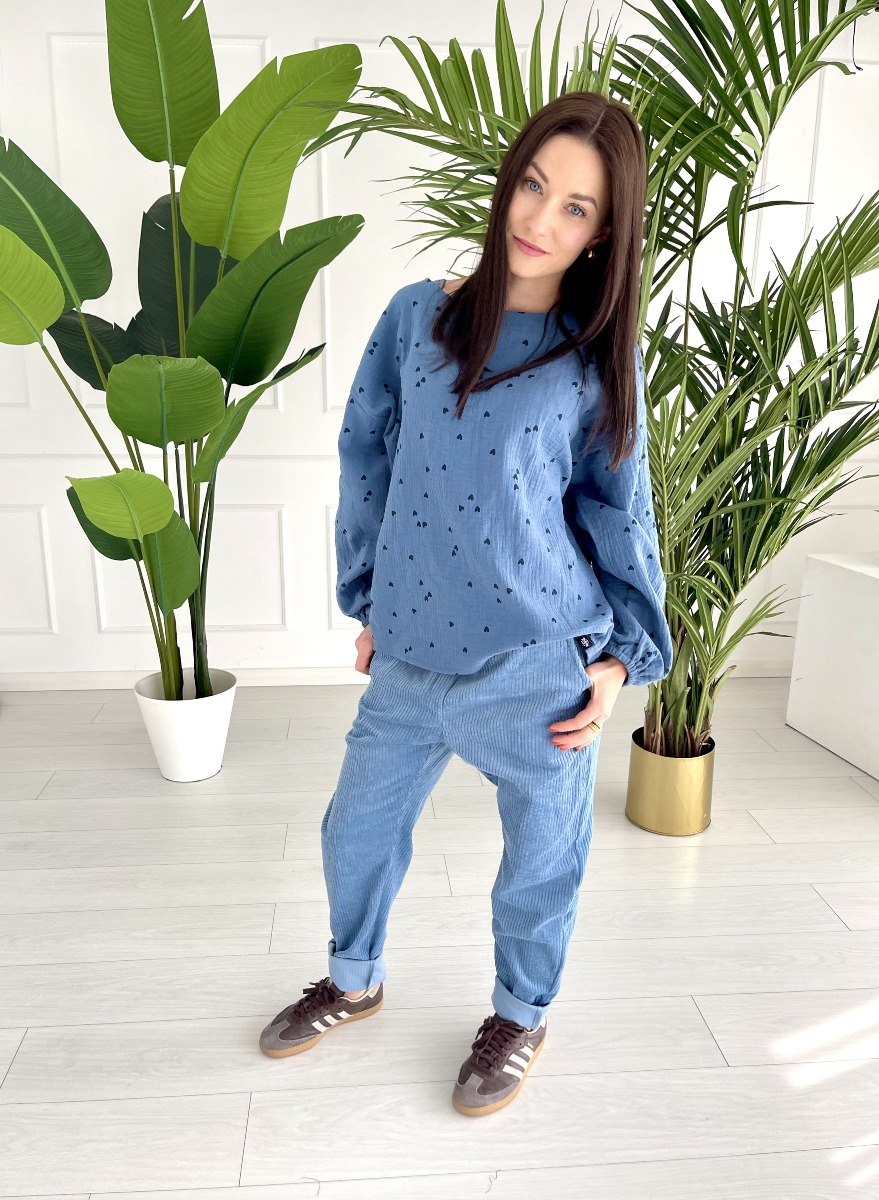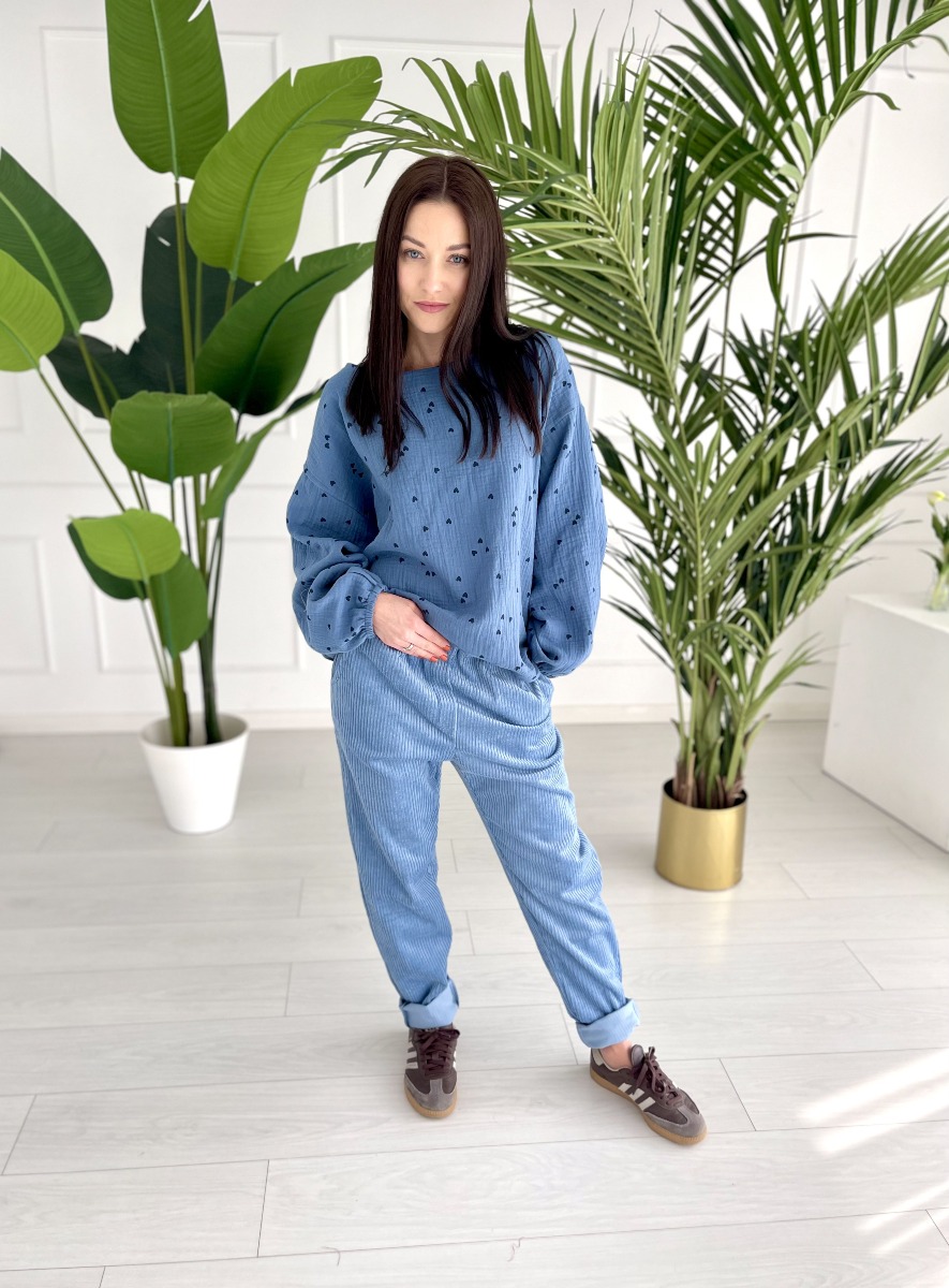 Niebieskie spodnie sztruksowe damskie Blue Sky – wygodne spodnie oversize 100% bawełna