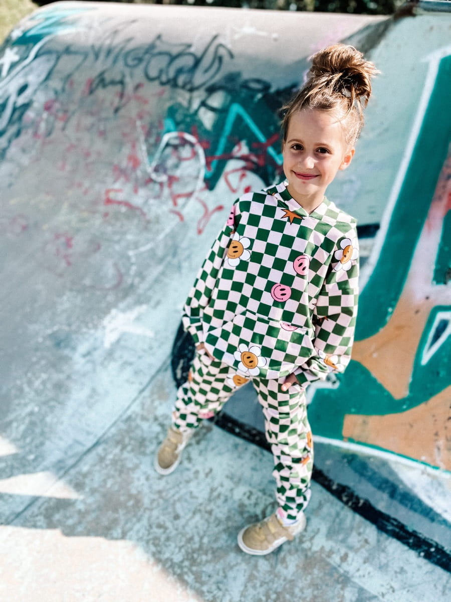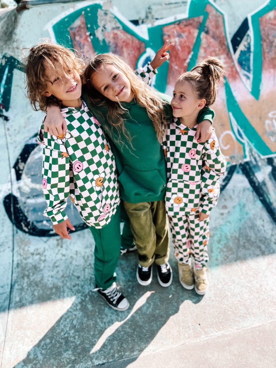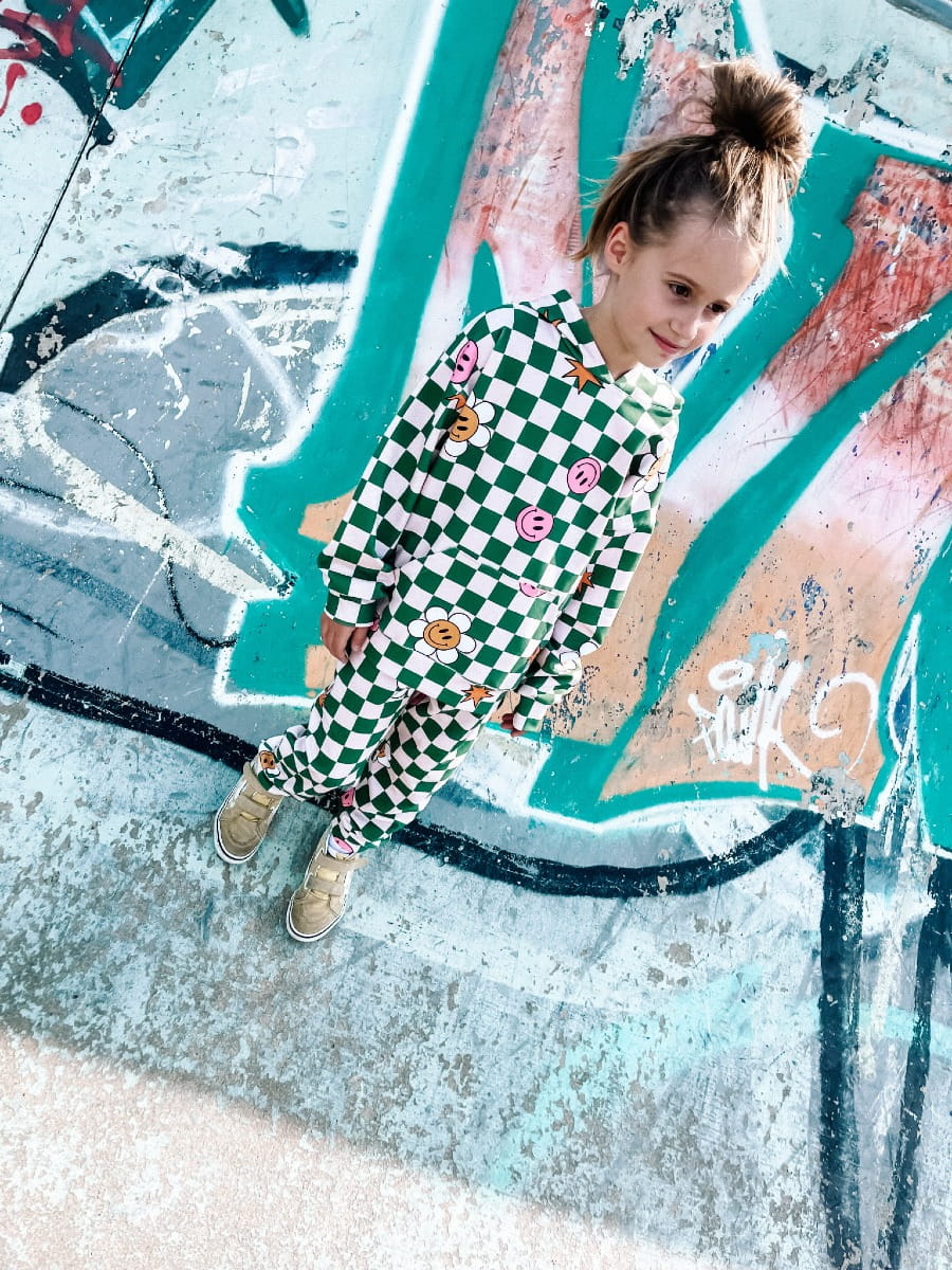 - autorski print w kremowo zieloną kratę i kolorowe emotki