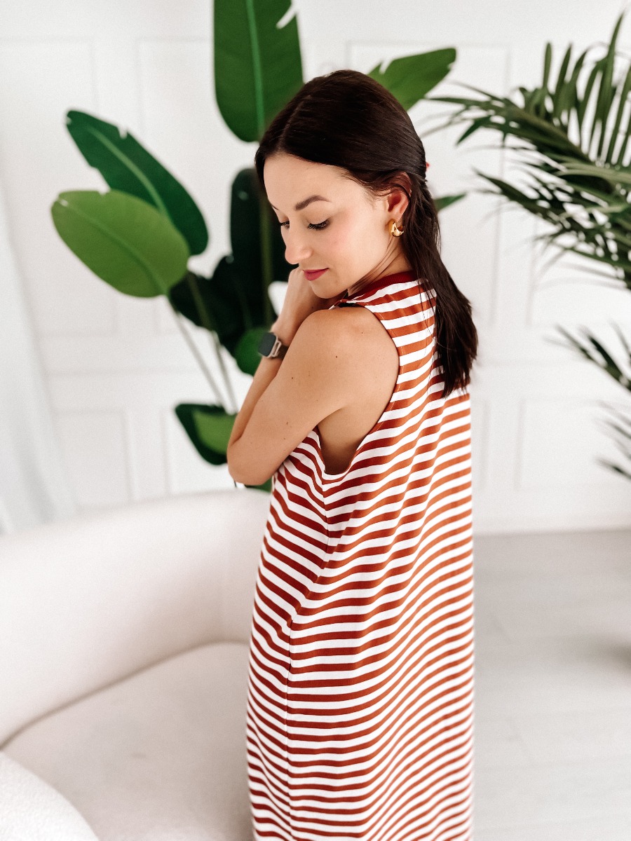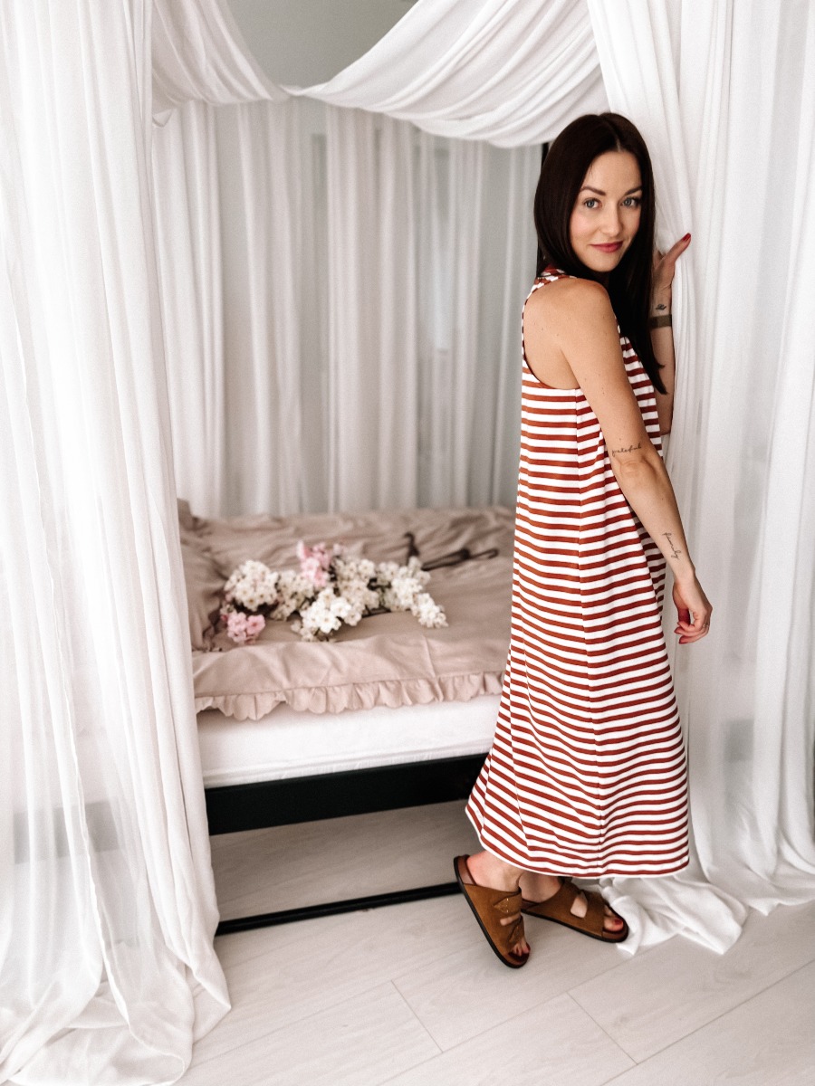 - sukienka w ceglane pasy – stylowy, ciepły odcień