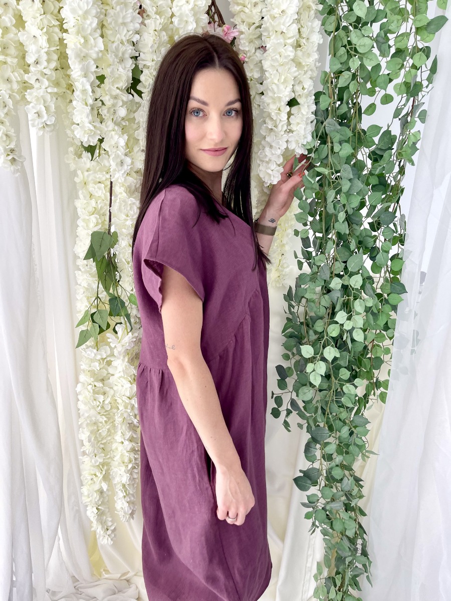 Model posiada kobiecy dekolt w serek oraz krótki, luźny rękaw. Długość midi sprawia, że to doskonała lniana sukienka na lato, na co dzień, do pracy, na wakacje czy spacer. Wystarczy dobrać sandały, espadryle lub sneakersy, aby stworzyć lekką, letnią stylizację.