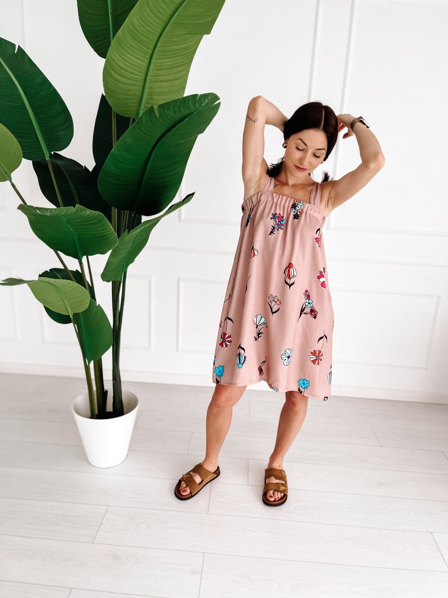 Luźny fason na ramiączkach pięknie układa się na sylwetce, a elastyczna gumka nad biustem delikatnie dopasowuje się do figury, podkreślając jej kształty bez uczucia ucisku. Grubsze ramiączka gwarantują wygodę i stabilność noszenia przez cały dzień.