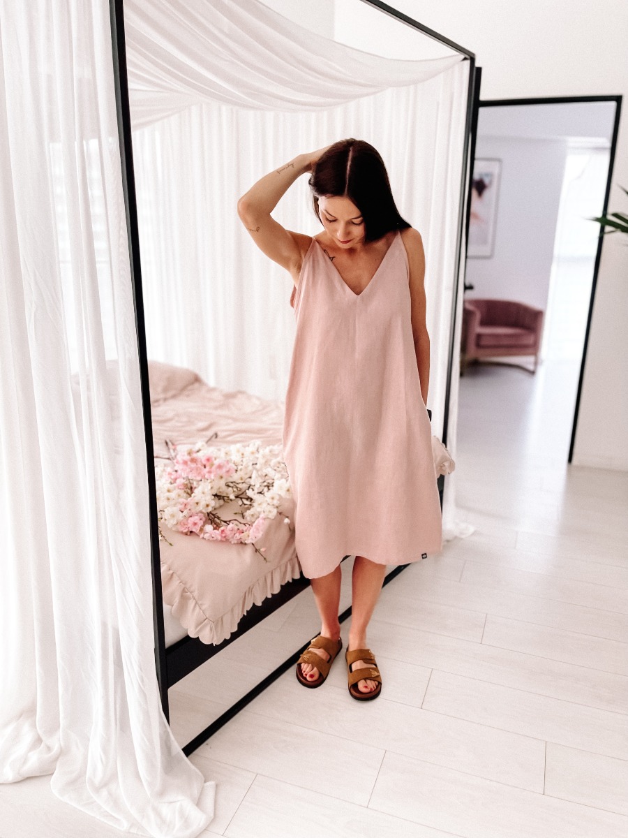 Pastelowo różowa lniana sukienka oversize – lekka sukienka na lato 100% len