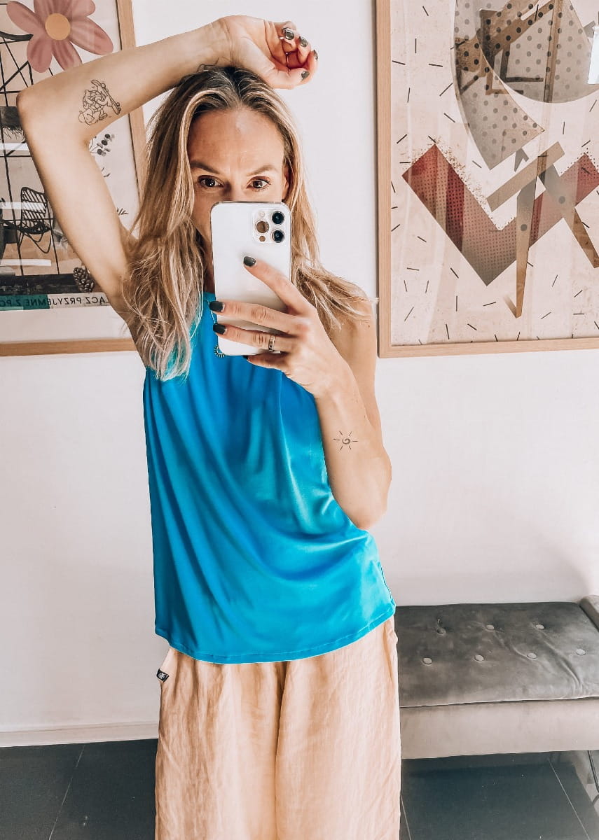 Top uszyty z bardzo lekkiego materiału w kolorze turkusowym.